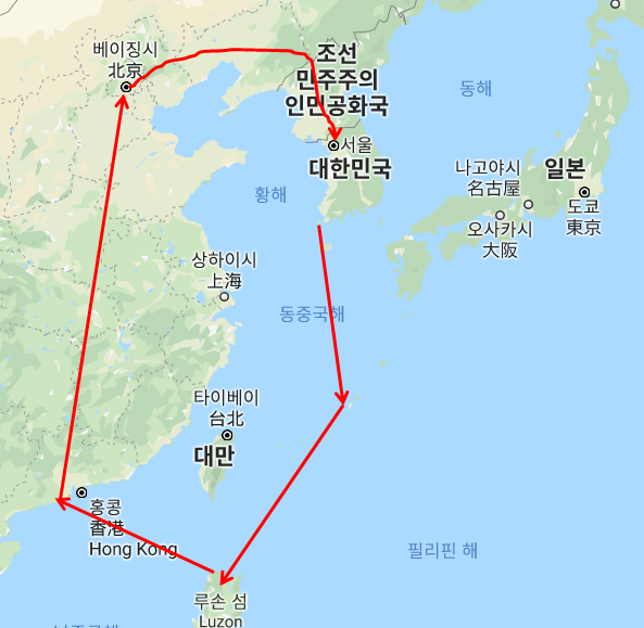 문순득의 3년 2개월여에 걸친 이동 경로는 우이도 → 류큐국(오키나와) → 여송(필리핀의 루손섬) → 마카오 → 북경 → 한양 → 전남 우이도입니다. 지도로 표시하면 아래와 같네요. 당시 시대상을 감안하면 오키나와, 필리핀, 청나라를 다녀왔다는 것이 굉장히 흥미로운 이야기가 아닐 수 없습니다.