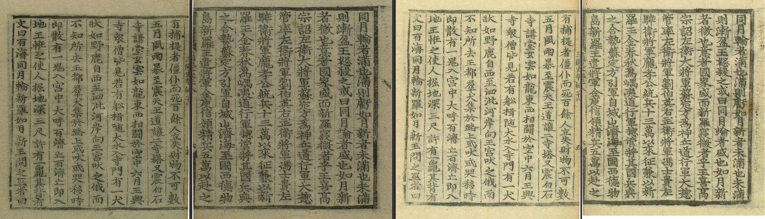 六月, 王興寺衆僧皆見, 若有舩楫随大水入寺門. 有一犬狀如野鹿, 自西至泗沘河岸, 向王宫吠之, 俄而不知所去. 王都羣犬集於路上, 或吠或哭, 移時即散. 有一鬼入宫中大呼, “百濟亡, 百濟亡.” 即入地. 王恠校勘 013之, 使人掘地. 深三尺許, 有一龜. 其背有文曰, “百濟同月輪, 新羅如月新.” 王問之, 巫者曰, “同月輪者滿也, 滿則虧, 如月新者未滿也, 未滿則漸盈.” 王怒殺之. 或曰, “同月輪者盛也, 如月新者㣲也. 意者國家盛, 而新羅寢校勘 014㣲者乎.” 王喜.
